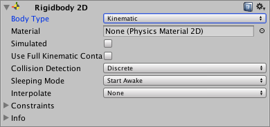 This can be inconvenient when you are using physics queries (such as Physics.Raycast) to detect where and how a Rigidbody 2D should move, and when you require multiple Kinematic Rigidbody 2Ds to interact with each other. Enable Use Full Kinematic Contacts to make Kinematic Rigidbody 2D components interact in this way.