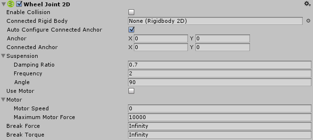 Use the Wheel Joint__ 2D__ to simulate a rolling wheel, on which an object can move. You can apply motor power to the joint. The wheel uses a suspension “spring” to maintain its distance from the main body of the vehicle.