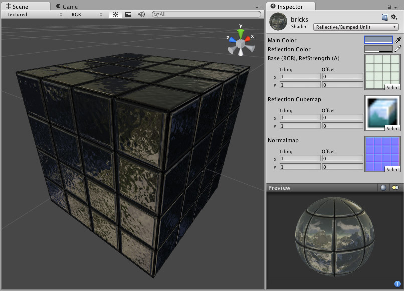 which will define what exactly is reflected. The main texture’s alpha channel defines the strength of reflection on the object’s surface. Any sceneA Scene contains the environments and menus of your game. Think of each unique Scene file as a unique level. In each Scene, you place your environments, obstacles, and decorations, essentially designing and building your game in pieces. More info