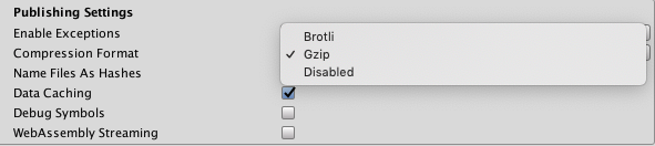 See in Glossary Method for your build, Unity identifies the extension that corresponds with the compression method and adds this extension to the names of the files inside the Build subfolder. If you enable Decompression Fallback, Unity appends the extension .unityweb to the build file names. Otherwise, Unity appends the extension .gz for the Gzip compression method, or .br for the Brotli compression method.