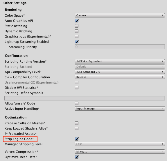 Open the Player settings (menu: Edit > Project Settings, then select the Player category), open the Other Settings panel, and enable Strip Engine Code to ensure an efficient build.