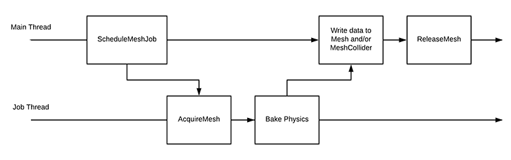 If you provide a MeshCollider to GenerateMeshAsync, Unity also computes the MeshCollider’s acceleration structure (“Bake Physics” in the above diagram). This can be time-consuming for large meshes, so it also occurs on the worker thread.
