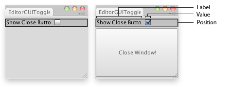 void OnGUI() { showClose = EditorGUI.Toggle(new Rect(0, 5, position.width, 20), "Show Close Button", showClose); if (showClose) if (GUI.Button(new Rect(0, 25, position.width, 100), "Close Window!")) this.Close(); } }