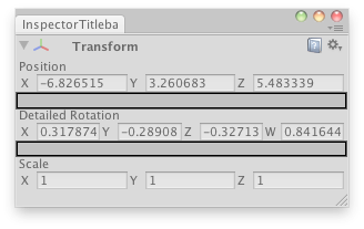 void OnGUI() { if (Selection.activeGameObject) { selectedTransform = Selection.activeGameObject.transform; fold = EditorGUILayout.InspectorTitlebar(fold, selectedTransform); if (fold) { selectedTransform.position = EditorGUILayout.Vector3Field("Position", selectedTransform.position); EditorGUILayout.Space();
