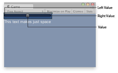 void OnGUI() { hSbarValue = GUILayout.HorizontalScrollbar(hSbarValue, 1.0f, 0.0f, 10.0f); GUILayout.Label("This is a text that makes space"); } }