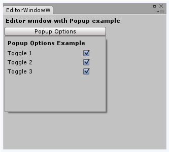 Below is an example of a custom popup window which is displayed via a button in an editor window. The Popup has three toggle values, and will automatically close when it loses focus. The example is given as two scripts. The first defines an editor window that can be opened via a menu item. That editor window has a button which shows the popup. The second script defines the contents of the popup itself as a separate class.